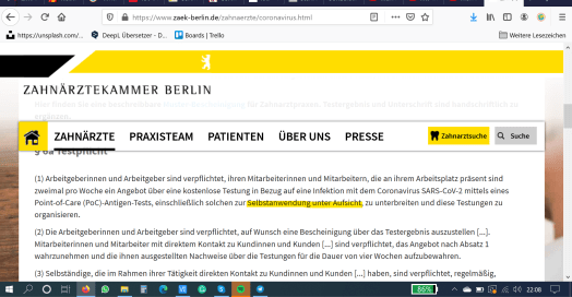 Von rechtswidrigen Ausgangssperren, Berufsverboten, Bildungsverhinderung, Besuchs- und Reisebeschränkungen, unfreiwilliger Beaufsichtigung und Erhebungen von medizinischen Befunden und Daten von ArbeitnehmerInnen durch ArbeitgeberInnen. Das Bild unten dokumentiert den gestrigen Screenshot von der Zahnärztekammer Berlin. Wir sollen unsere MitarbeiterInnen nun auf Antigene vom neuen Corona-Virus testen oder beim Selbsttest beaufsichtigen.